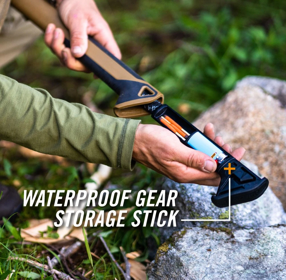 Og så ligger der en genialitet i, hvad du ikke kan se, nemlig en udtagelig kile, der indeholder 9′ rebsnor til nødvendige småopgaver og et par geniale opbevaringsrum, som grundet O-pakningen er vandtætte og som kan rumme både et lille ildstål, en lille lighter eller lidt kvas til optænding, så du har altid har tørt optændingsmateriale tilgængelig.
