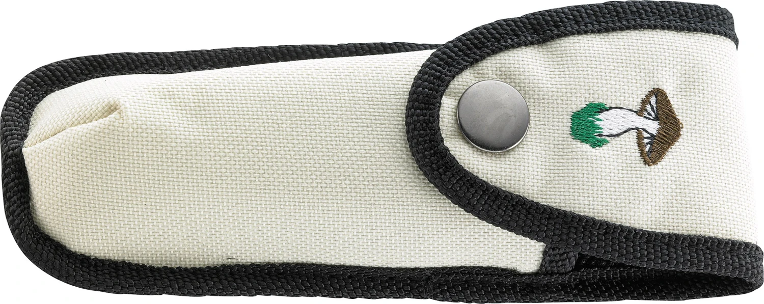Mushroom Knife with Brush AISI 420 vejer blot 108 gram og leveres med et smukt lille etui og en lille fiks karabin, så den fx kan fastgøres i bæltestroppen.