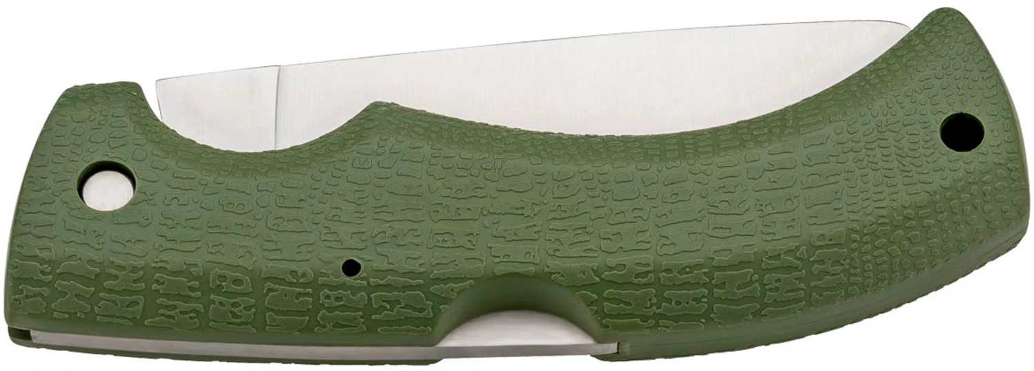 Den dobbelttandede sav er fremstillet af 3 mm. tykt, rustfrit 3Cr13 stål, og når savbladet foldes ud, låses det forsvarligt fast med en robust baglåsemekanisme. Det olivenfarvede håndtag er lavet af skridsikkert gummi og ligger rigtig godt og sikkert i hånden, selv med våde hænder. Hullet bagerst på håndtaget er praktisk, hvis du fx vil binde en snor i saven, så den ikke så nemt bliver væk.