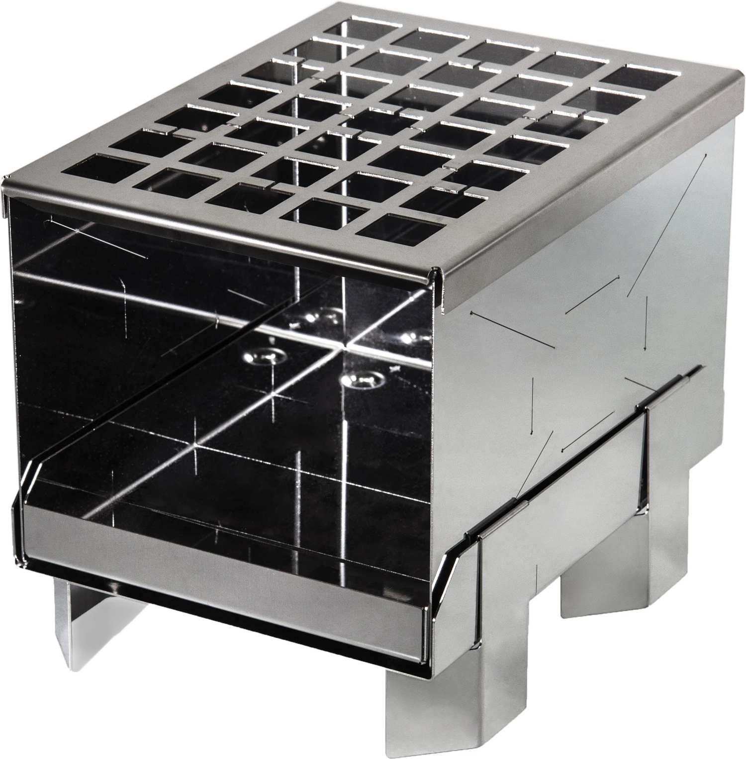 Med denne Firebox FB1 fra Petromax er det ikke længere nødvendigt at ikke slæbe gas, sprit eller petroleum med på tur, når frokosten skal indtages eller kaffen skal laves på turene i det fri. Find blot nogle grene og træstykker i passende størrelse og tænd op i ovnen, som efterfølgende er nem at varmeregulere og holde kørende, da træstykkerne tilføres gennem den store åbning i enden.