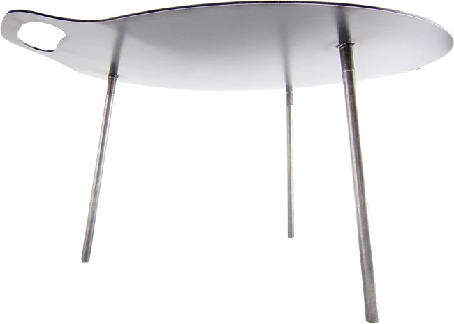 Panden har en diameter på 56 cm. og er udstyret med praktisk bæregreb i hver side. Længden på de tre ben er 23 cm, og de kan selvfølgelig skrues af, så panden fylder mindst muligt under transport.