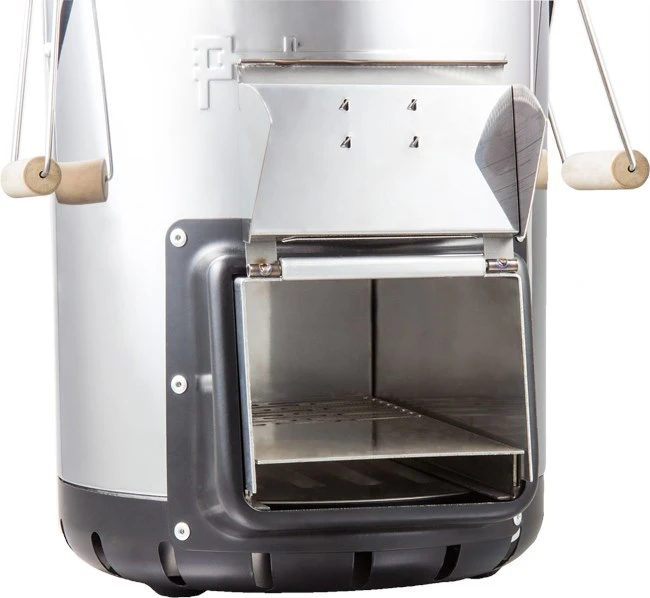 Petromax Rocket Stove RF33 er fremstillet af rustfrit ædelstål med støbejernsplade øverst, og de praktiske bærehåndtag med trægreb gør ovnen nem at flytte rundt på.