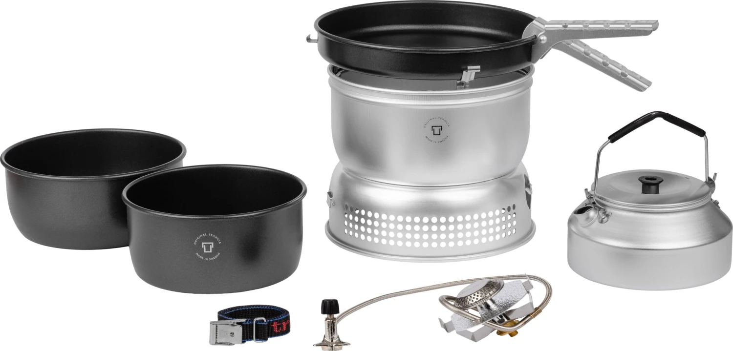 Trangia Kitchen 25-6 UL (Ultra Light) er et lækkert stormkøkken, hvor både gryderne på hhv. 1,5 og 1,75 liter og panden med en diameter på 22 cm er fremstillet i det eksklusive Non-Stick, medens læskærmene er fremstillet i let aluminium. Derudover får du en kedel i aluminium med en volumen på 0,9 liter, som lige passer ned i den mindste gryde.